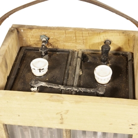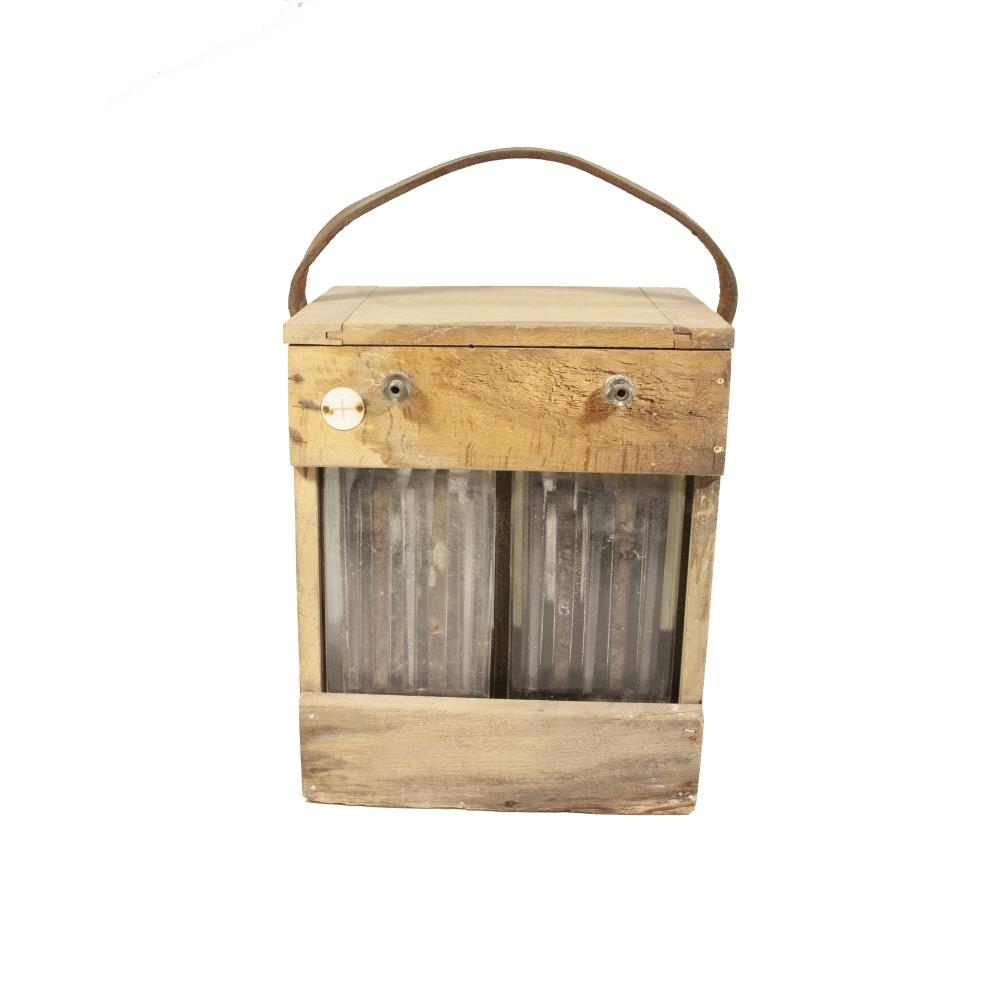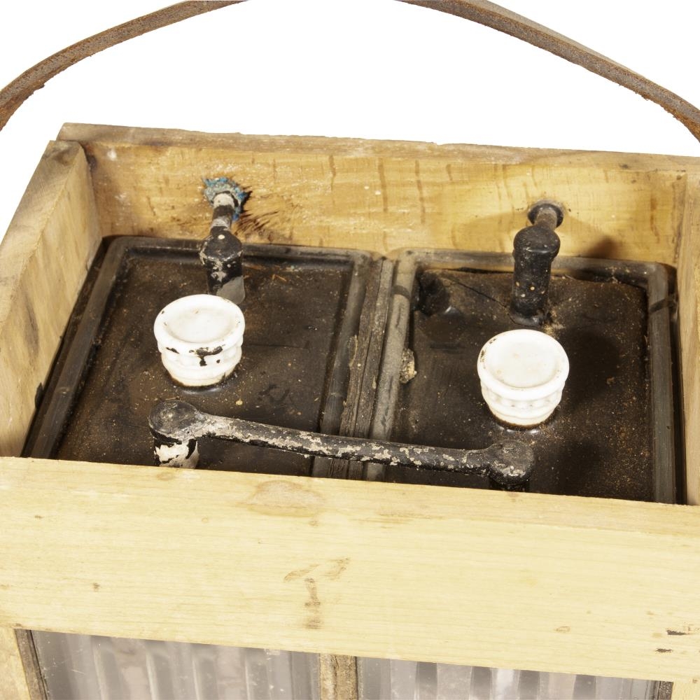 Rafgeymirinn er í trékassa með hertu gleri með tveimur viðnáms-tökkum og handfang úr leðri.