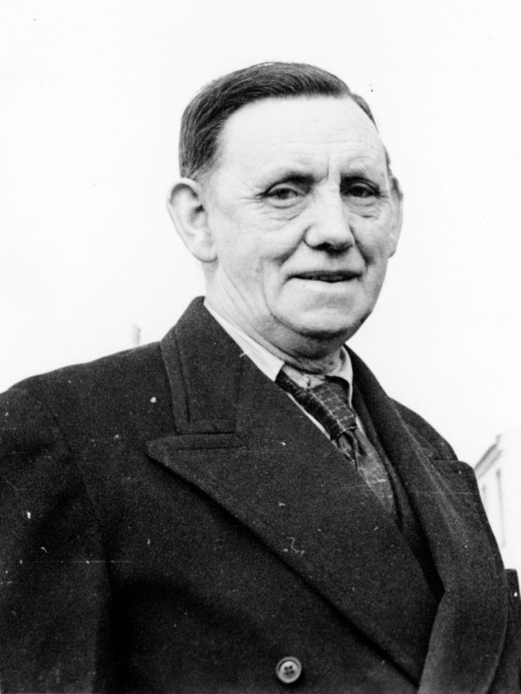 Stígur Sæland, lögregluþjónn, klæddur ljósri skyrtu, dökku, köflóttu bindi og tvíhnepptum dökkum frakka yfir.