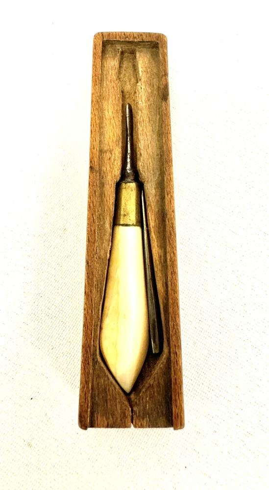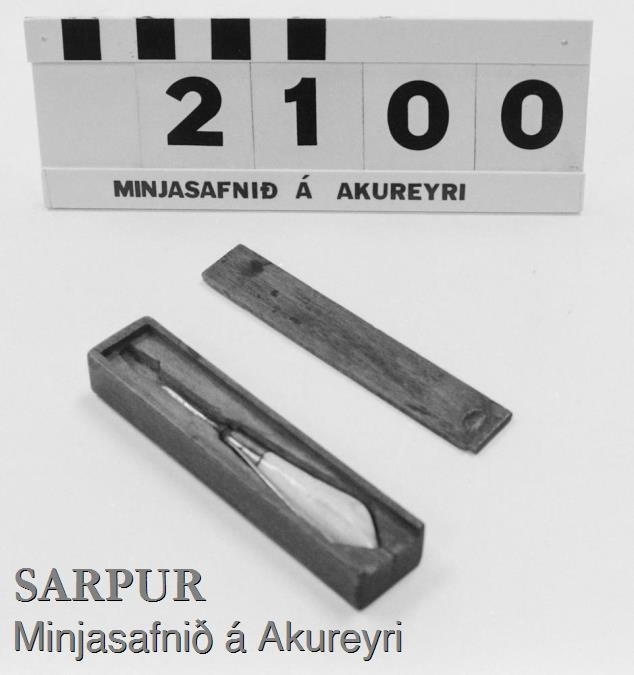 Hvítt skaft úr beini eða tönn, mjókkar fram. Þar er á messinghólkur 1 sm. á breidd en upp í skaftið gengur svo nálin sem stendur fram úr skafti. Nálin er í lítlum beykikassa með dragloki gerðum fyrir nálarstærðina. Lítil skaftlaus nál fylgir. Þetta er bólusetninganál Árna Ásgrímsson hreppstjóra að Kálfsstöðum í Skagafirði. Mun hann hafa haft þann starfa að ferðast um og bólusetja gegn kúabólu.