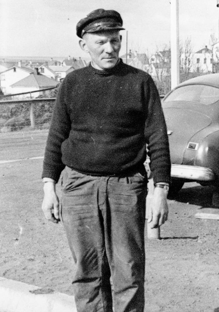 Þorbjörn Eyjólfsson, verkstjóri, stendur á horni Reykjavíkurvegar og Skúlaskeiðs í Hafnarfirði klæddur dökkum buxum, dökkri peysu og ber kaskeiti á höfði sér.