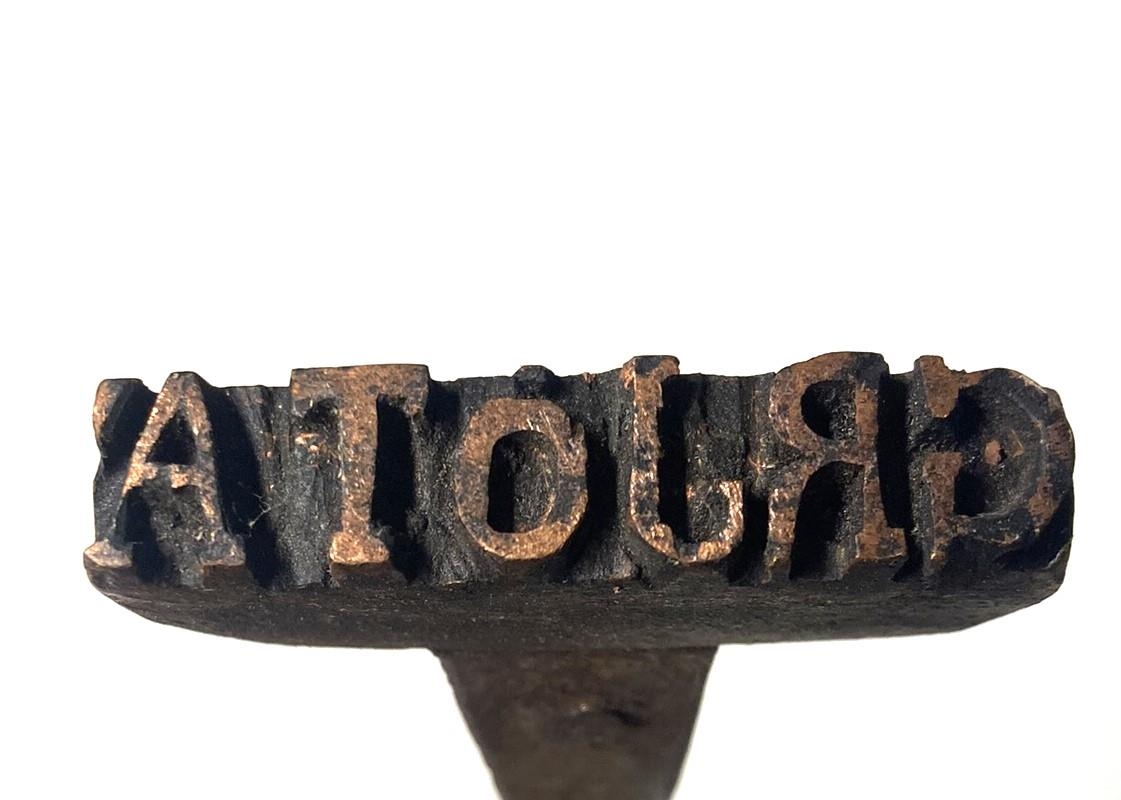 Brennimark, merkt: GRJÓTÁ. það er úr eir, fest á langa járnstöng með lykkju á enda. Lengd 39 cm.