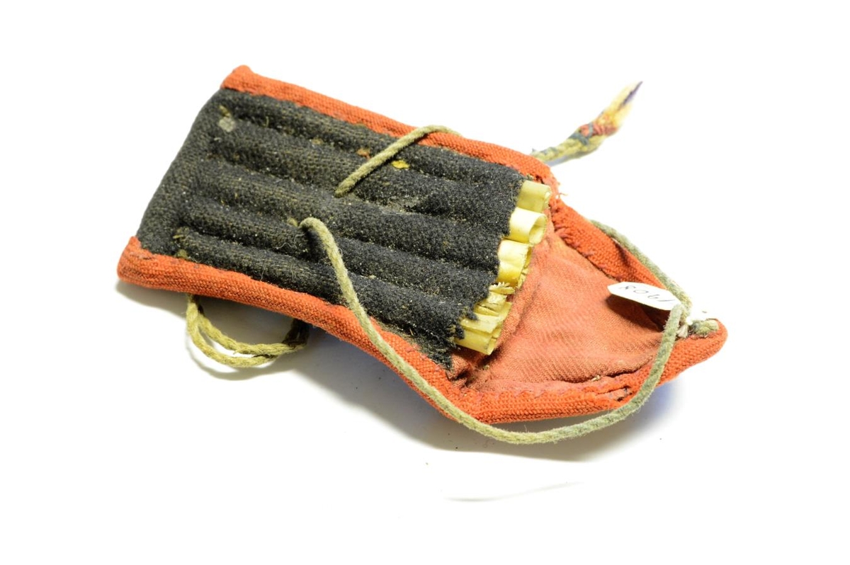 Fjaðranálhús með 5 stöfum. Svart ullarefni með rauðu fóðri í loki. Rauðar bryggingar. Á loki er saumað blóm, gult með brúnleitum fræjum í miðju. Lok fest með bandi sem þrætt er í gegnum nálhúsið. Var í eigu Vilborgar Tómasdóttur á Hrútafelli. Gef. frú Helga Ólafsdóttir á Hrútafelli.