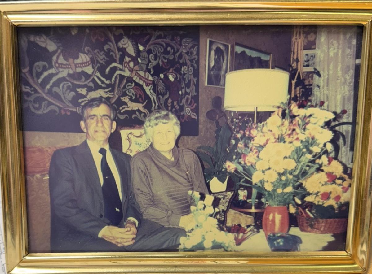 Innrömmuð ljósmynd, í gylltum ramma, 18 x 13 cm. Sigurbergur Magnússon og Elín Sigurjónsdóttir á heimili sínu í Steinum.