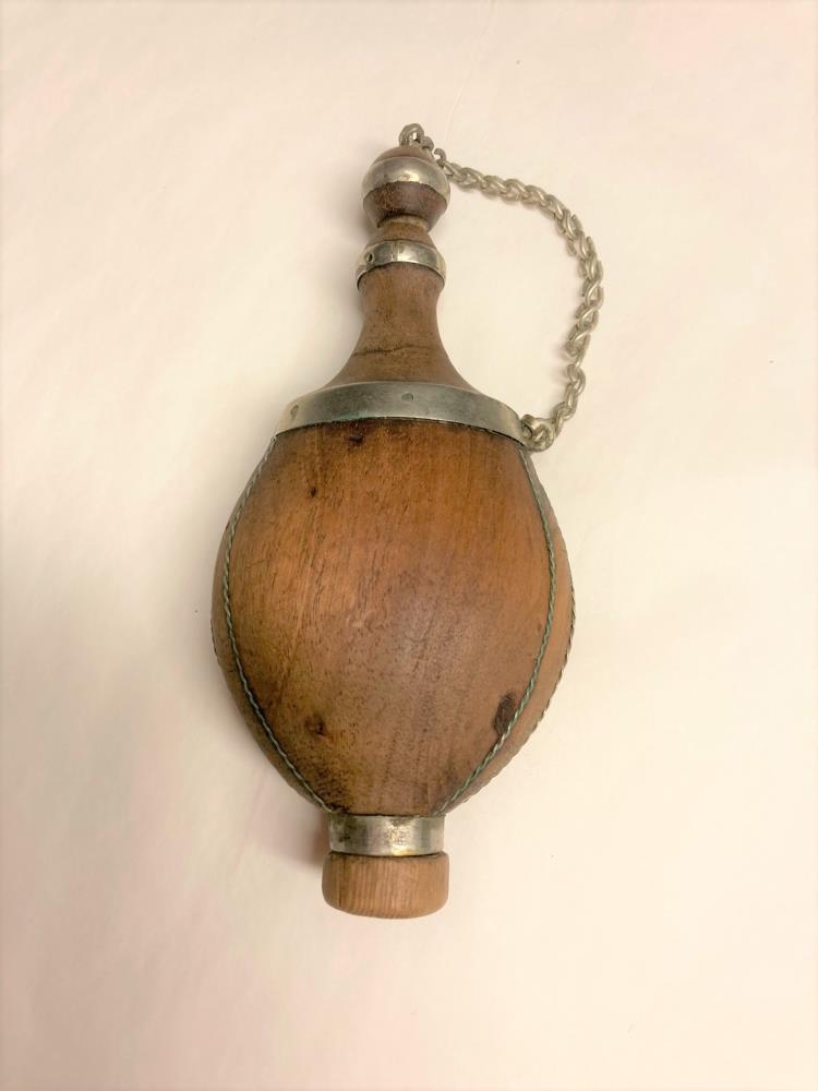 Tóbaksbaukur úr mahóní, sporöskjulagaður búinn silfurgjörðum og snúrum. (nýsilfur?) Gefinn af Jóhanni Guðmundssyni kaupmanni í Steinum, sem fékk hann fyrir fáum árum hjá manni í Reykjavík.
