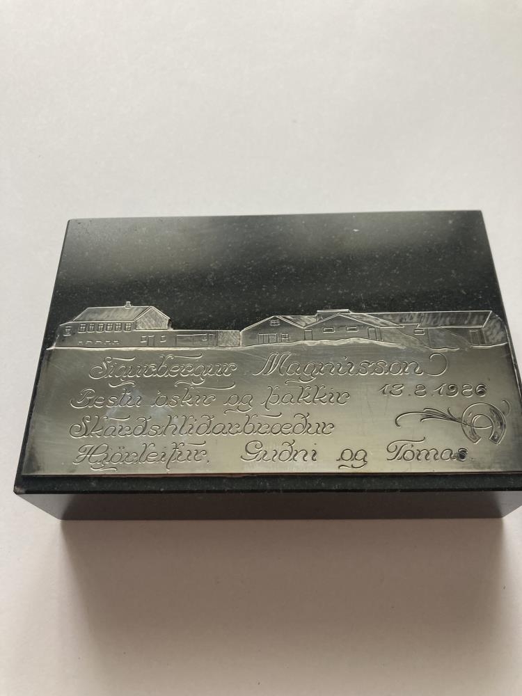 Grafinn silfursköldur festur í svartan, ferkantaðan stein, að stærð 12 x 8 cm.. Á hann er grafinn bær Elínar og Sigurbergs Magnússonar í Steinum og þessi áletrun: "Sigurbergur Magnússon. Bestu óskir og þakkir 13.8.1986. Skarðshlíðarbræður, Hjörleifur, Guðni, Tómas." Þetta er 70 ára afmælisgjöf. Væntanlega verk Björns Halldórssonar leturgrafara.