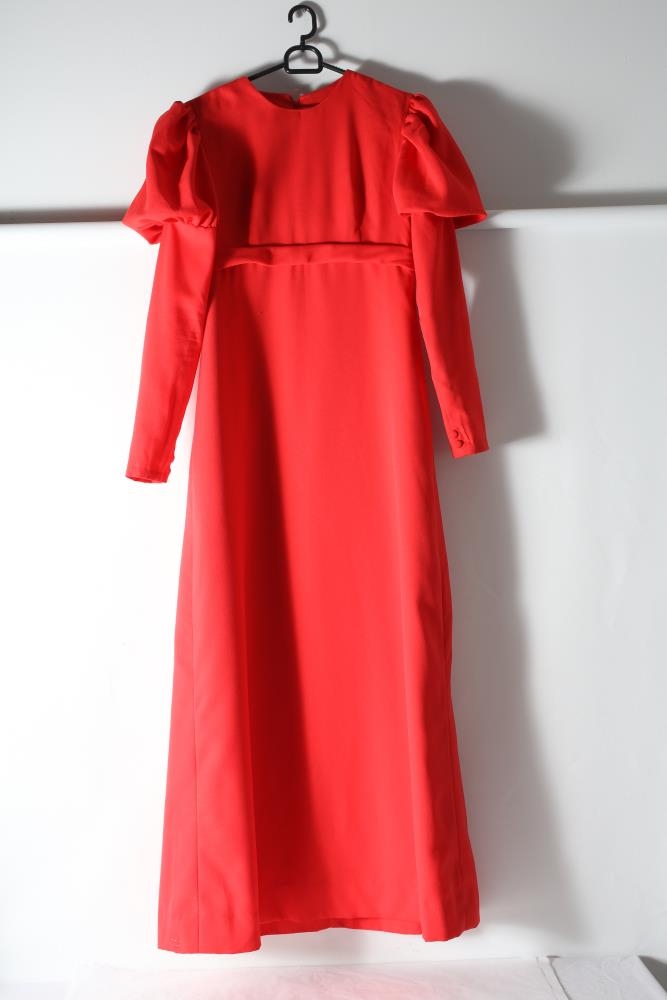 Rauður síður brúðakjóll með síðum púffermum. Tveir hnappar fremst á ermum. Renndur að aftan. Saumaður af Þórunni Þórhallsdóttur á Egilsstöðum árið 1971 fyrir gefanda, Ragnheiði Ragnarsdóttur. Tengdasonur Þórunnar, Gissur Þór Árnason, saumaði handsauminn. Ragnheiður klæddist kjólnum þegar hún og Birgir Þór Ásgeirsson voru gefin saman af sr. Ágústi Sigurðssyni í stofunni á Fossvöllum I í Jökulsárhlíð þann 7. ágúst 1971.