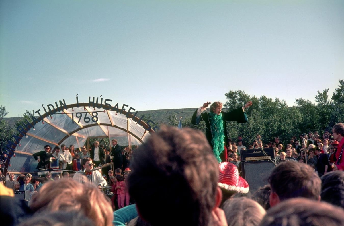 Húsafell. Hljómar spila á útihátíð og mannfjöldi að fylgjast með. Söngvari stekkur. 1968