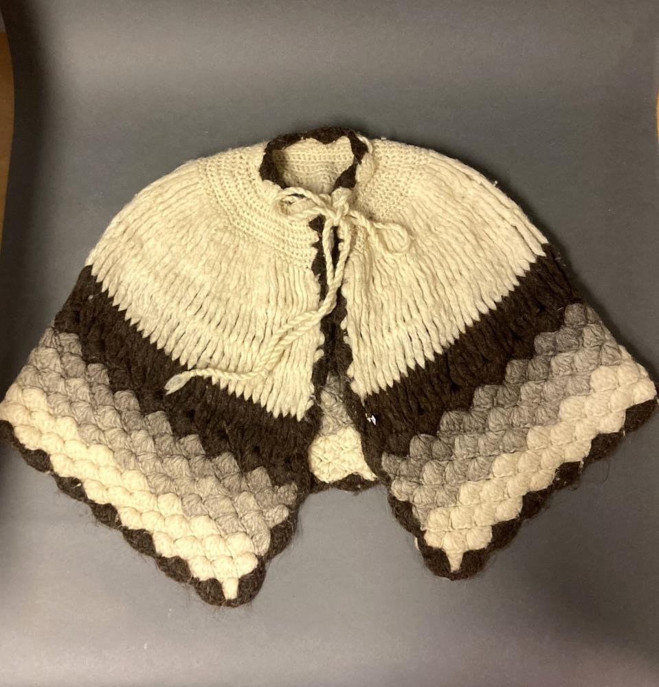 Herðaslá, hekluð úr lopa (sauðalitir). Úr dánarbúi Hólssystra í Efri-Ey í Meðallandi, Guðrúnar og Þorgerðar Bjarnadætra. Afhent af Guðmundi Óla Sigurgeirssyni kennara á Kirkjubæjarklaustri: