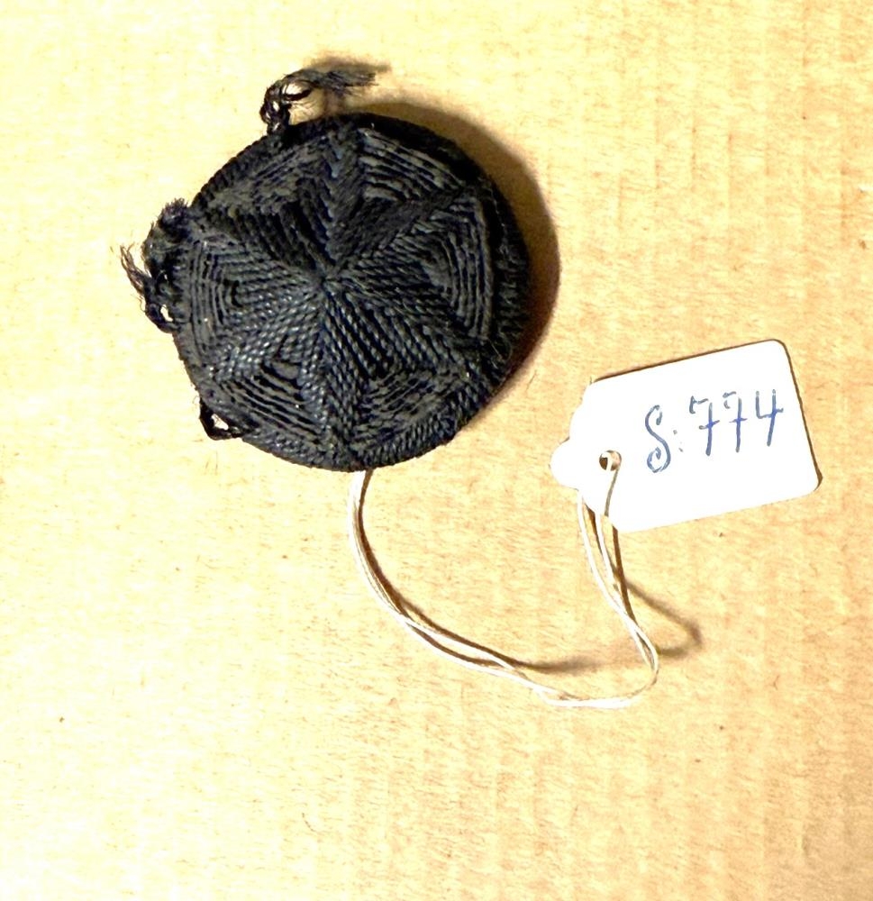 Stór yfirdekktur, saumaður hnappur, með skrautrós. Saumað er með svörtum hör. Virðist frá presthempu eða kvenhempu. Úr eigu Jóhönnu Árnadóttur. Afi hennar var sr. Jón Sigurðsson, er nefndur var Bægisárkálfur. Gripir gefnir af frú Ingveldi Tómasdóttur í Presthúsum í Mýrdal.