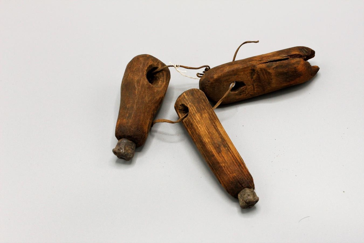 Þrír samstæðir smáhlutir festir upp á þvengspotta, einn gallaður. Virðast bókbandsáhöld. Þetta eru skreyttar blýstéttir festar upp á skaft. Nánari ákvörðun verður að bíða betri tíðar.