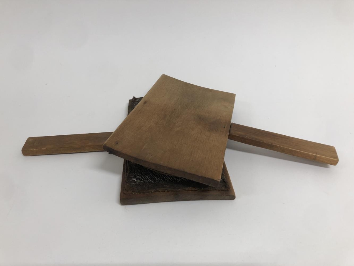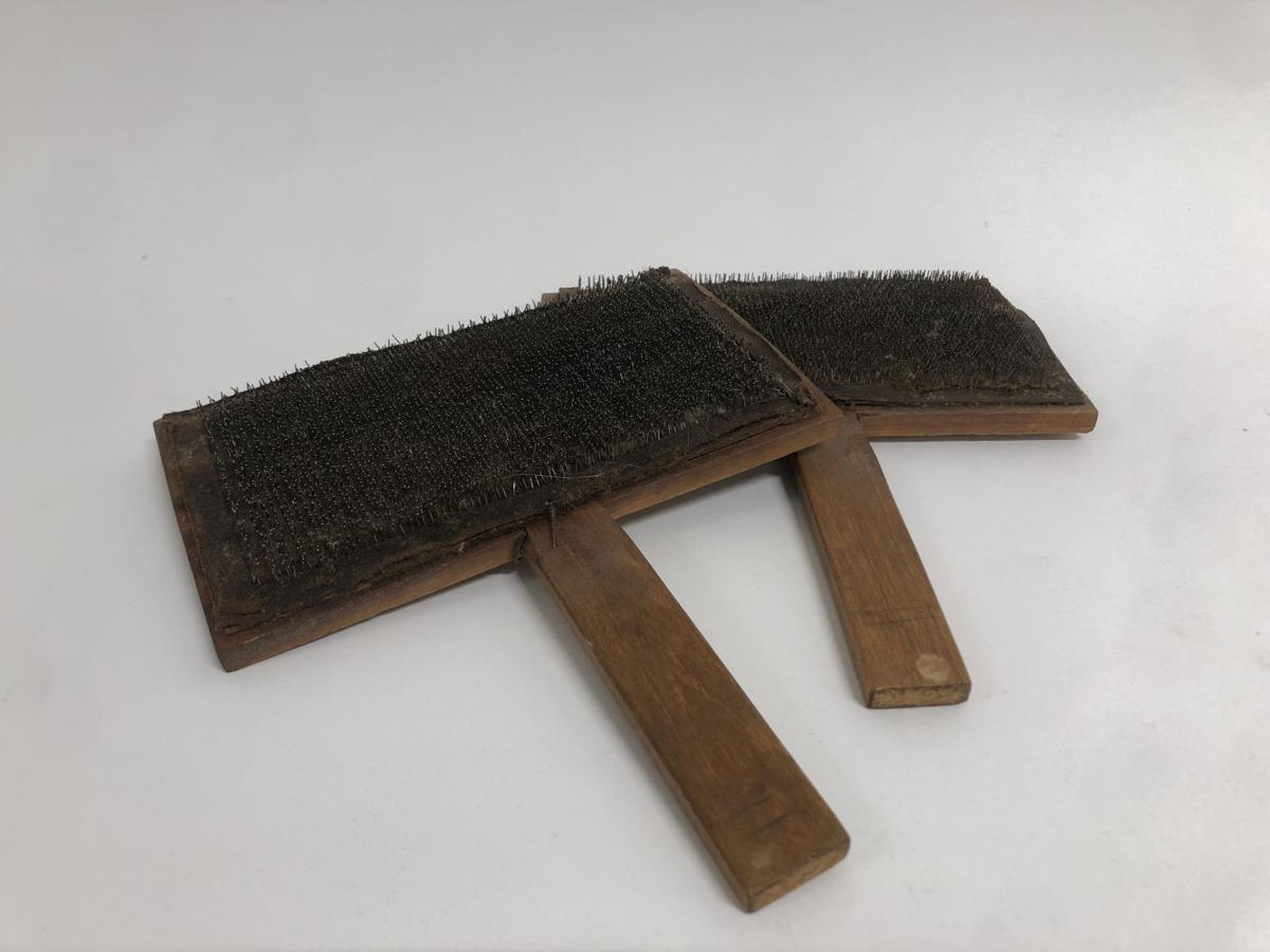 Ullarkambar (þelkambar). Par af hefðbundinni gerð. Spjöldin eru 12,5 x 22 cm með skinnpúða sem er þéttsettur stáltindum, púðarnir eru negldir á jöðrunum við spjöldin; handföngin eru 13,5 x 3 cm. Handföngin eru felld inn í spjöldin innan frá.
