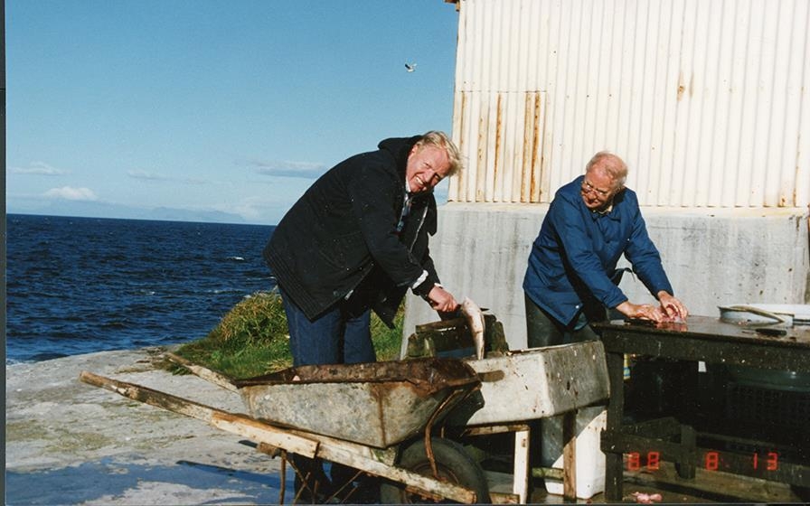 Guðmundur Þorgeirsson frá Lambastöðum í Garði og Agnar Breiðfjörð Sigurvinsson gera að ný veiddum aflanum við sjóhúsið á Lambastöðum.