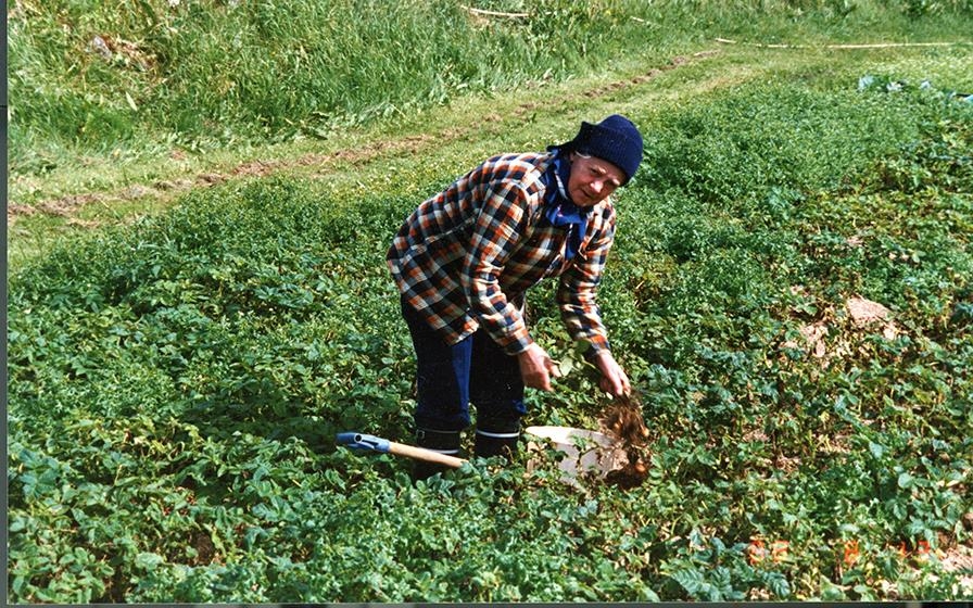 Magnea Þorgeirsdóttir frá Lambastöðum í Garði tekur upp kartöflur í garðinum við Lambastaði.