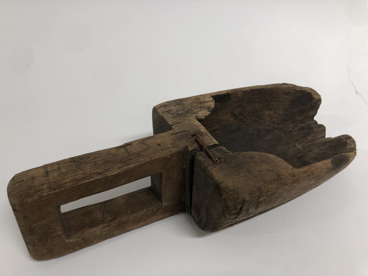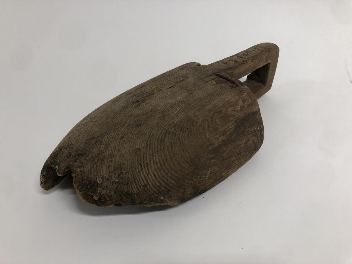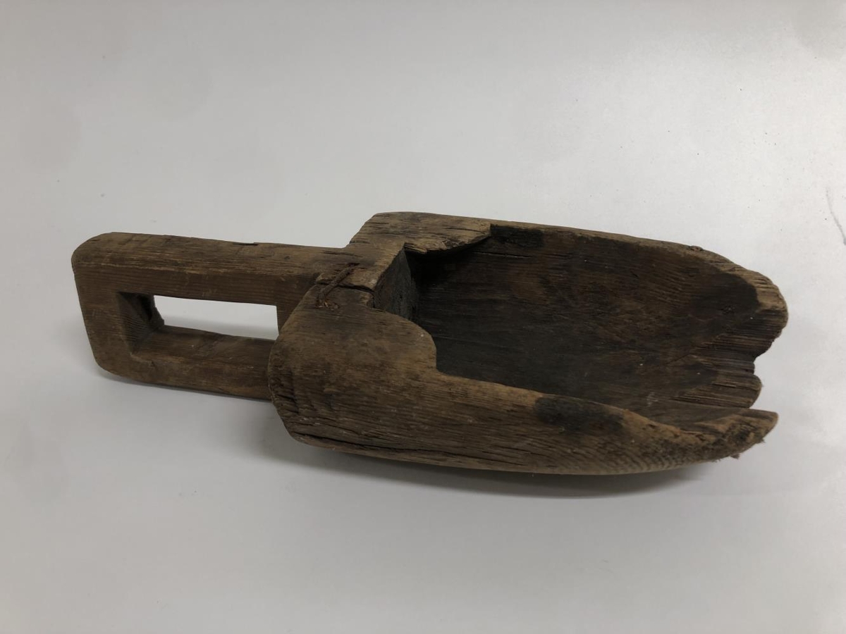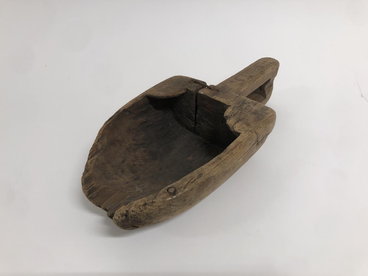 Gripurinn er smíðaður úr heilum við. Að öllum líkindum austurtrog, notað til að ausa vatni úr minni bátum. Gert hefur verið við gripinn, járnsaumur er á tveimur stöðum til að stöðva gliðnun. Bókstafir og tölustafir hafa verið skornir út í handfangið sem erfitt er að greina.