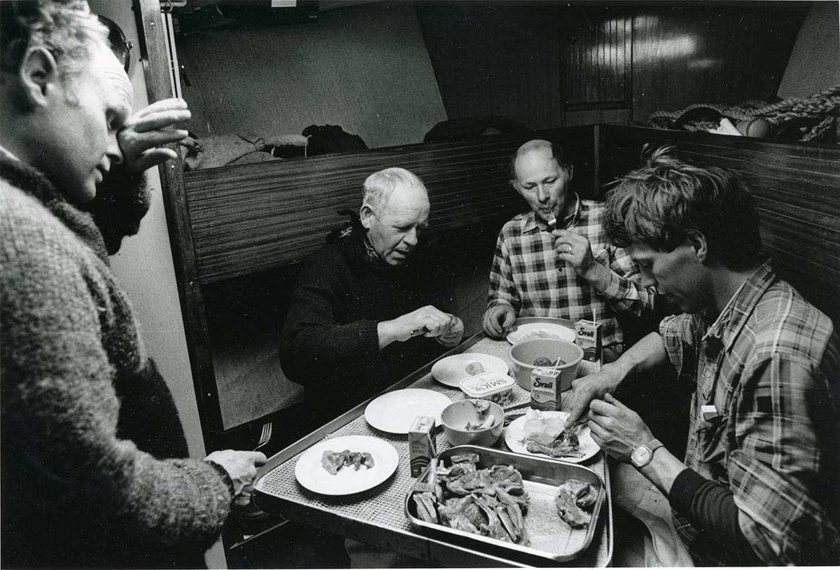 Í lúkarnum um borð í Sveini Guðmundssyni GK-315. Frá vinstri: Ásmundur Björnsson frá Sunnuhvoli, Þorsteinn Einarsson frá Skiphól, Svavar Óskarsson frá Hvoli og Kristinn Arnar Pálsson. Þeir bjuggu allir í Garðinum á þessum tíma.