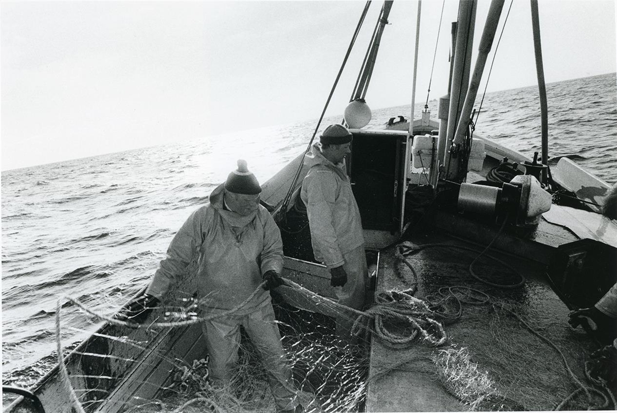 Um borð í Sveini Guðmundssyni GK-315. Ásmundur Björnsson frá Sunnuhvoli í Garði og Svavar Óskarsson frá Hvoli í Garði að störfum úti á dekki.