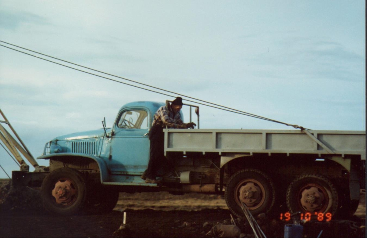 Guðni Ingimundarson frá Garðstöðum í Garði við störf sín árið 1989. Trukkurinn blái var hans atvinnutæki.