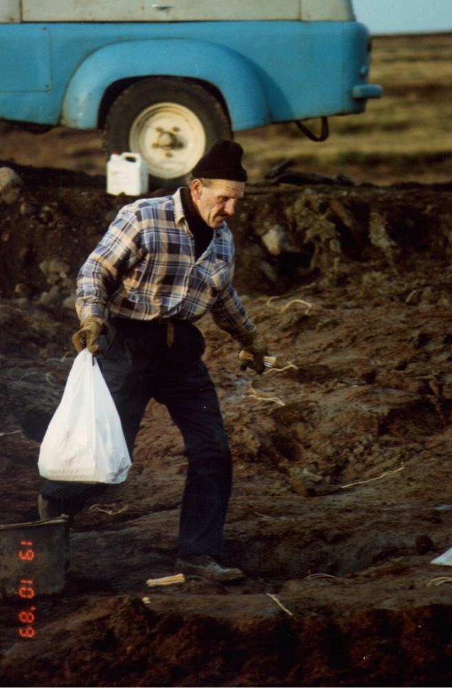Hér er verið að undirbúa byggingu vatnstanks sem er í heiðinni fyrir ofan Garðveg árið 1989. Fyrsta verk er að sprengja upp klappir og jarðveg áður en hafist er handa við byggingu tanksins. Það er Guðni Ingimundarson frá Garðstöðum í Garði sem stýrir verkinu.