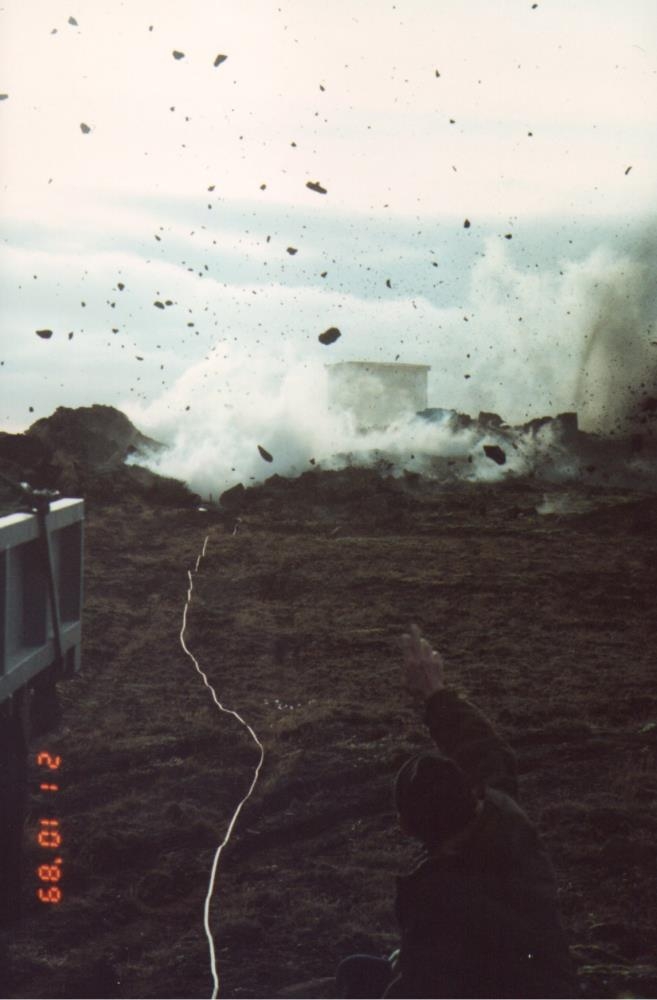 Hér er verið að undirbúa byggingu vatnstanks sem er í heiðinni fyrir ofan Garðveg. Fyrsta verk er að sprengja upp klappir og jarðveg áður en hafist er handa við byggingu tanksins. Það er Guðni Ingimundarson frá Garðstöðum í Garði sem stýrir verkinu sem greinilega hefur tekist mjög vel.