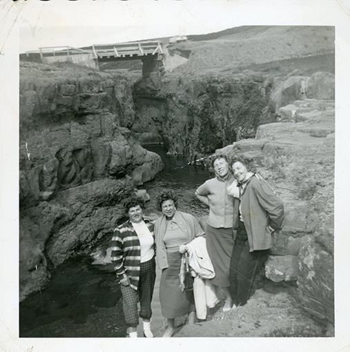 Félagskonur í kvenfélaginu Gefn í Garði á ferðalagi í Dalabyggð, líklega á kvenréttindadaginn 19. júní. Hér eru þær staddar við ána Skraumu í Hörðudal. Frá vinstri: Marta Guðrún Halldórsdóttir frá Bjarmalandi, Halldóra Jóna Valdimarsdóttir frá Bjargi, Guðrún Hermannsdóttir frá Hellu og Sigríður Þorbjörnsdóttir frá Mörk, allar búsettar í Garðinum á þessum tíma.