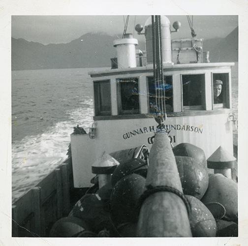 Gunnar Hámundason GK 357 á reknetum. Jónatan Agnarsson skipstjóri frá Keflavík á útkíkkinu í stýrihúsinu.