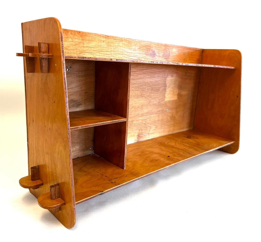 Hilla úr barnaherbergi. Önnur af tveimur eins hillum í uppbyggingu. Hillurnar hannaði og smíðaði Bárður Ísleifsson arkitekt, fyrir börn sín, Margréti og Leif fyrir árið 1950. Stærri hillan var fyrir Margréti sem var eldri. Hillurnar voru í sameiginlegu barnaherbergi þeirra Margrétar og Leifs að Reynimel 25 í Reykjavík en það hús teiknaði Bárður og lét reisa fyrir fjölskyldu sína árið 1946.