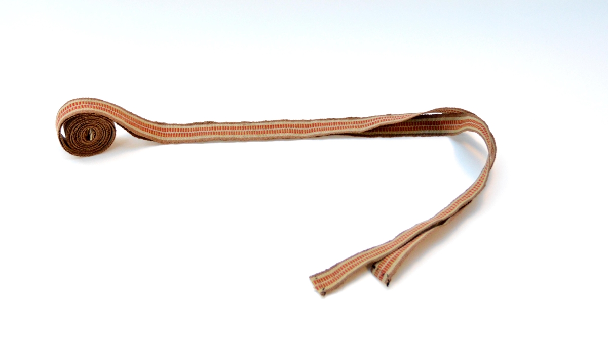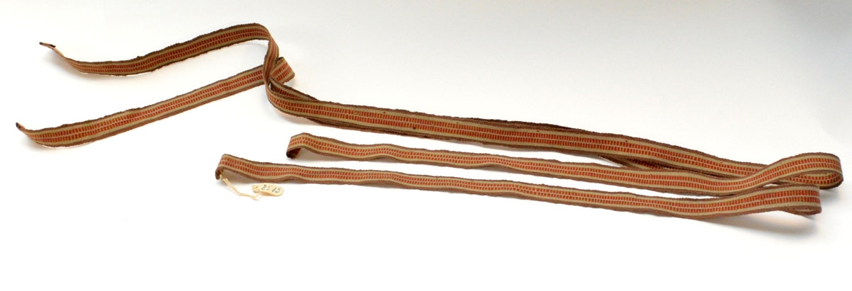 Sokkabönd Guðnýjar Bjarnadóttur, ca. 1,25 m. að lengd, br. 1,5 cm. Tennt og langröndótt. Uppistaða pg fyrirvaf garn. Ofin í vefstóli. Fjórir litir: brúnt, grátt, rautt og