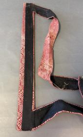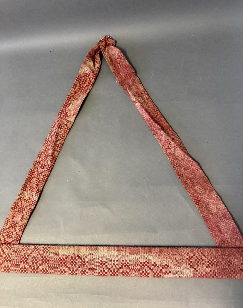 Ofið hengi, þríhyrnt, til að leggja á rúmábreiðu í gestaherbergi. Upplitað. Saumað utan um stíft tréspjald.