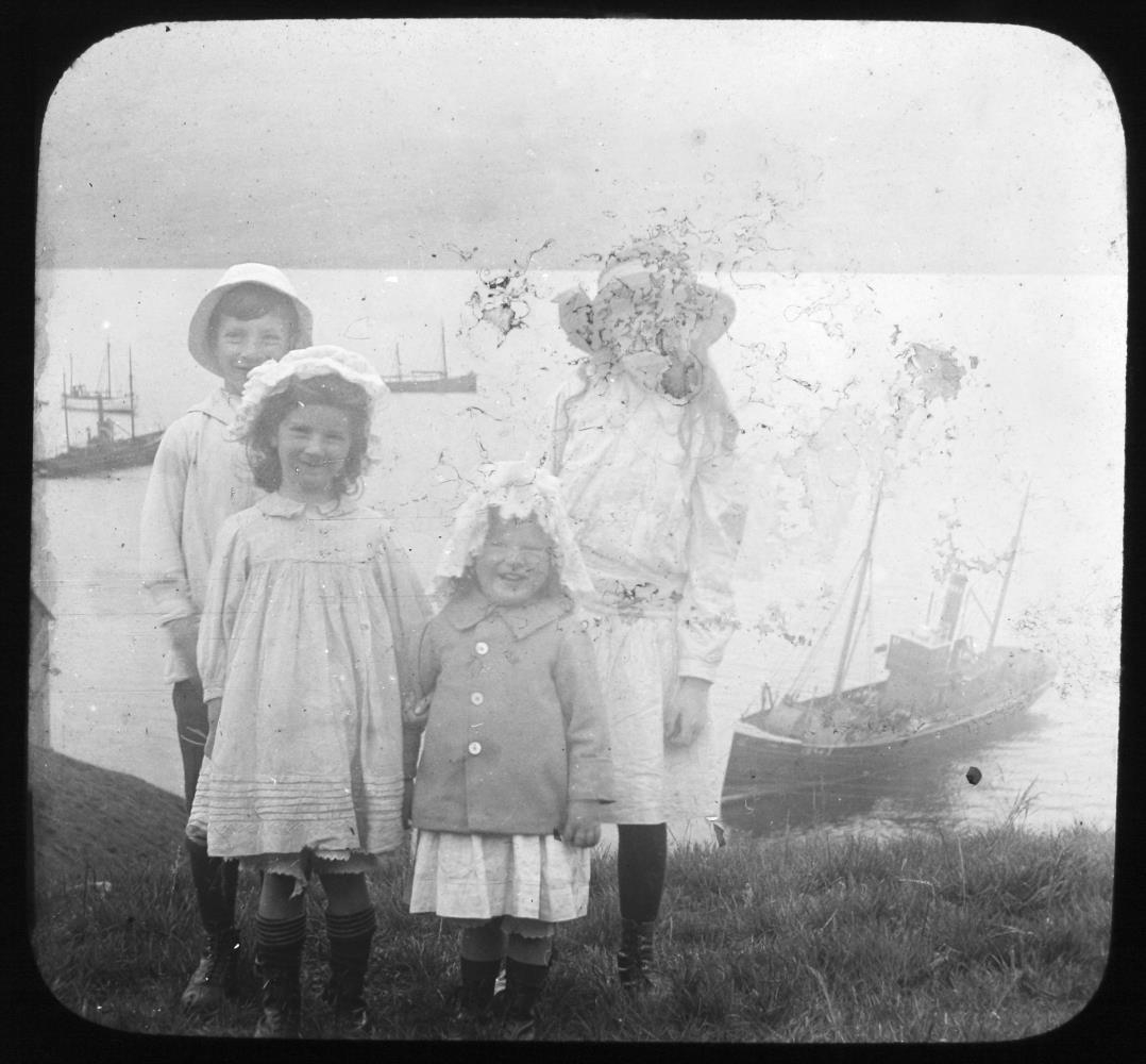Börn Arthur Gook, Phyllis Gook f.24.10.1915, Irene Gook f.11.8.1909, Eric Gook f.9.3.1911 og Mable Gook f.5.11.1913. Á pollinum er skip og er eitt þeirra lagst í fjörunni við Sjónarhæð.