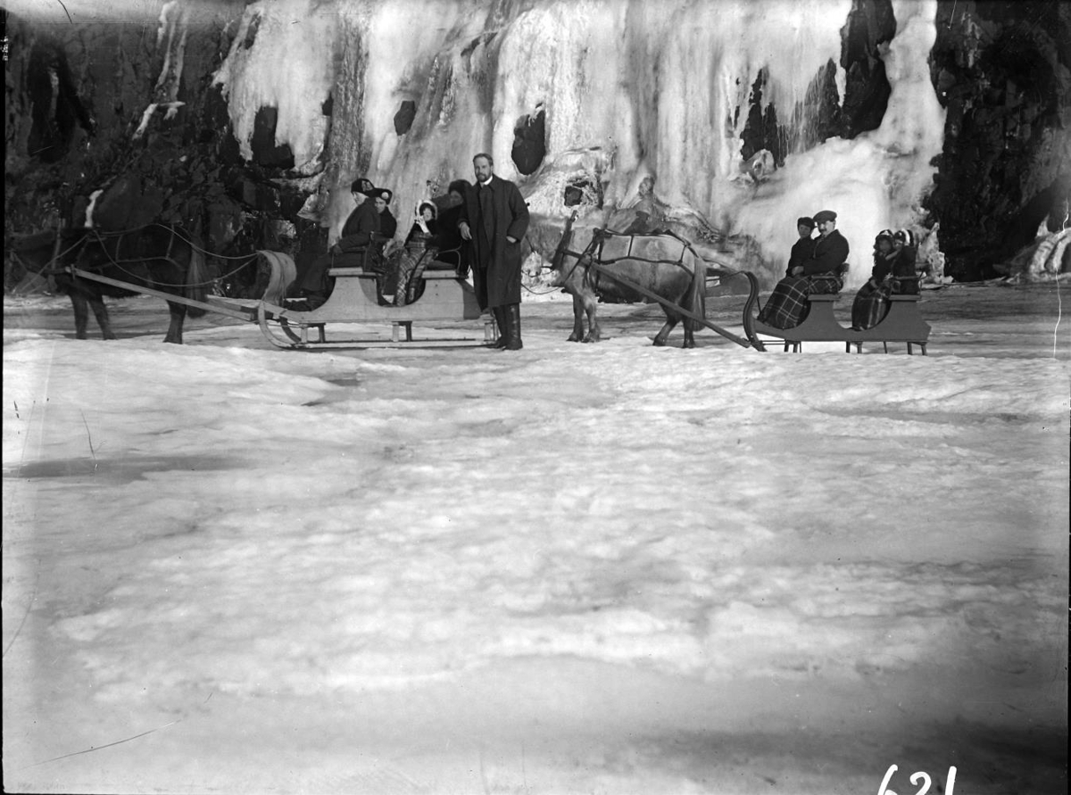 Sleðaferð á ísilögðum Pollinum við Akureyri, þessi mynd er tekin við frosinn foss í Vaðlaheiðinni.