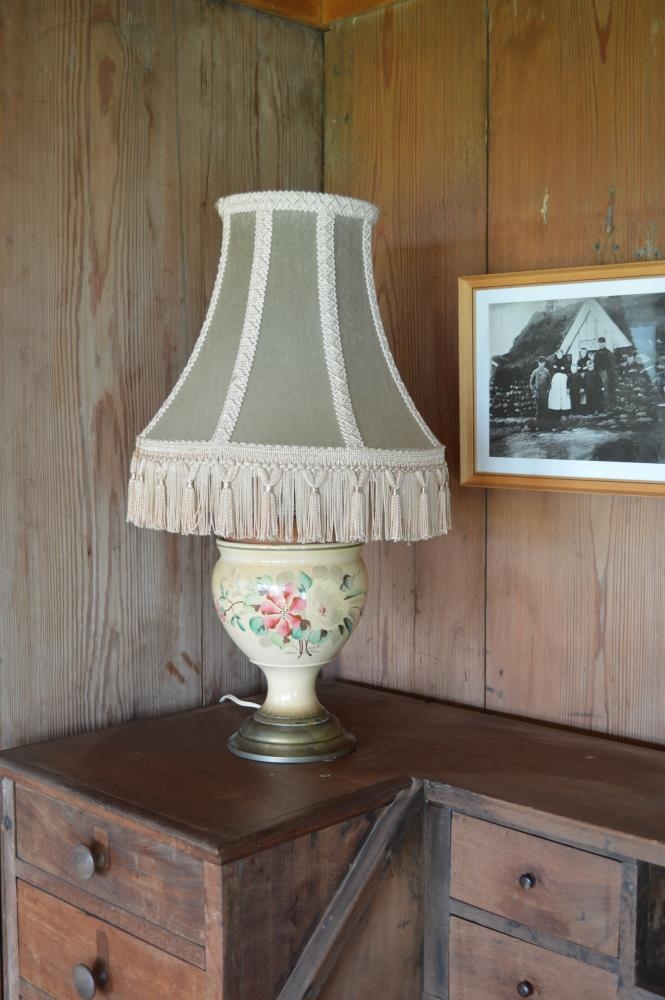 Borðlampi, upprunalega steinolíulampi en nú breytt í rafmagnslampa. Undirstaðan úr leir, bumbulaga og á fæti. Blómaskreyting. Olíuhylki úr gleri. Hæð nú um 53 cm, hæð þess sem eftir er af gamla lampanum 24 cm, þvermál undirstöðu mest um 15 cm. Lampinn er nú varðveittur í húsinu frá Holti á Síðu. Úr búi Árna Gíslasonar sýslumanns á Kirkjubæjarklaustri árin 1858-1880.