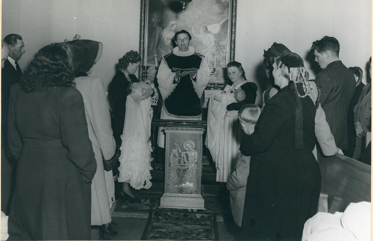 Skírn í Útskálakirkju í Garði árið 1949. Skírnarfontur sem Ríkharður Jónsson myndhöggvari gerði fyrir Útskálakirkju vígður og fyrstu börnin skírð við þá athöfn. Séra Eiríkur Brynjólfsson prestur á Útskálum fyrir altari. Til vinstri á myndinni heldur Margrét Sæmundsdóttir frá Miðhúsum í Garði á syni sínum undir skírn. Hann fékk nafnið: Jón Gunnar Torfason. Til hægri á myndinni er Guðrún Bjarnadóttir borin til skírnar. Guðrún var ættuð frá Kothúsum í Garði, mögulega er það föðuramma Guðrúnar, Guðrún Eggertsdóttir frá Kothúsum sem heldur á nöfnu sinni undir skírn. Lengst til vinstri má sjá Sigurberg Þorleifsson þáverandi meðhjálpara í Útskálakirkju. Það starf var eitt af mörgum trúnaðarstörfum sem Sigurbergur gegndi fyrir sitt samfélag.