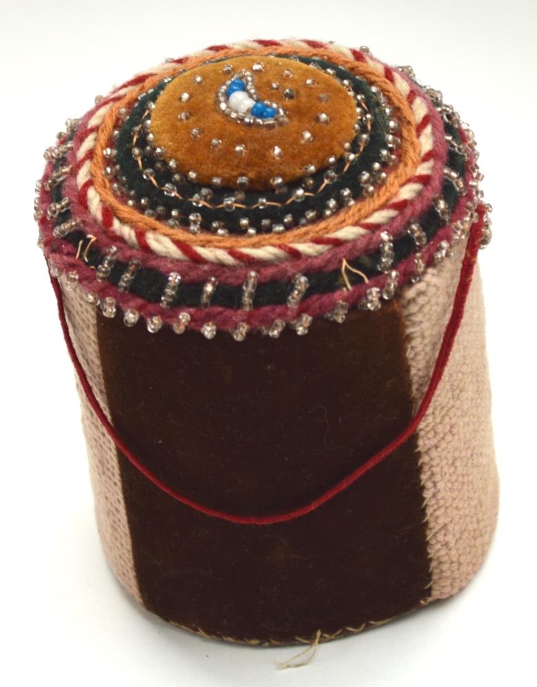 Pappaaskja, tauklædd og með loki, perlusaumuðu. Krosssaumur utan á öskjunni. Úr dánarbúi Sigurlaugar Helgadóttur frá Þykkvabæ að ráðstöfun hennar. Afhent af Elínu Frigg Helgadóttur. Elín systir Sigurlaugar og Halla Einarsdóttir móðir þeirra gerðu öskjuna og gáfu Sigurlaugu smábarni.