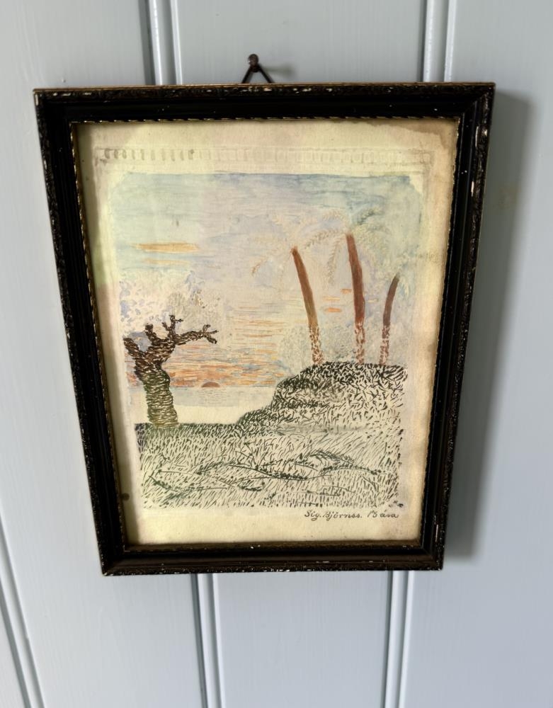Innrömmuð teikning 13 ára drengs, Sigurðar Björnssonar, Suður-Hvammi. Var sonur Björns Sigurðssonar frá Rauðafelli. Úr dánarbúi Bjarngerðar Ólafsdóttur frá Suður-Hvammi.