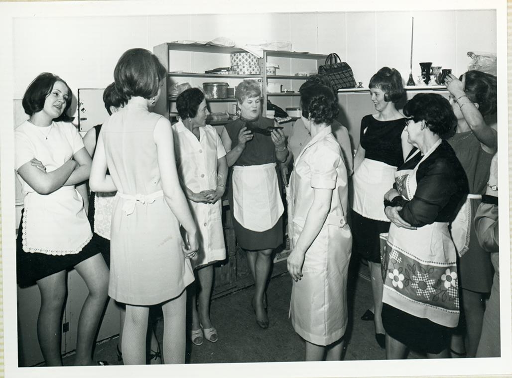 Frá 50 ára afmælisfagnaði kvenfélagsins Gefnar í Garði sem haldinn var í samkomuhúsinu í Garði 9. desember árið 1967. Kvenfélagskonur og aðstoðarkonur þeirra taka sér hvíld í eldhúsinu litla stund. Frá vinstri: Anna Gunnlaugsdóttir frá Blómsturvöllum, Þóra Margrét Sigurðardóttir frá Brautarholti, Guðríður Sigurðardóttir frá Nýjabæ, Marta Guðrún Halldórsdóttir frá Bjarmalandi, Helga Steinsdóttir frá Sólbakka, Soffía Ólafsdóttir frá Ásgarði, Anna Vigfúsdóttir bjó í Jónshúsi í Gerðum og Alda Ögmundsdóttir frá Heiðartúni, allar búsettar í Garði á þessum tíma.