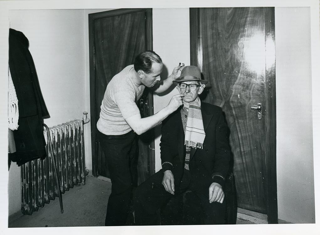 Frá 50 ára afmælisfagnaði kvenfélagsins Gefnar í Garði sem haldinn var í samkomuhúsinu í Garði 9. desember árið 1967. Magnús Gíslason frá Miðhúsum í Garði og Ingvar Júlíusson frá Bjargi í Garði búa sig undir að sýna leikþátt, afmælisgestum til skemmtunar.