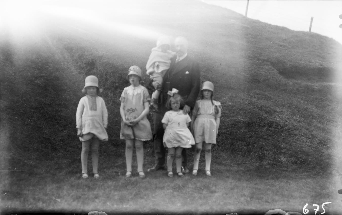 Arthur Gook f.11.6.1883 með dætrum Jóhanns Sveinssonar bak við Sjónarhæð. Soffía Jóhannsdóttir f.22.1.1925, Jóhanna Jóhannsdóttir 22.10,1922, Marsibil Baldvina Jóhannsdóttir f.6.5.1931,Sigríður Jóhanna Jóhannsdóttir f.11.11.1929 , hann heldur á Gígja Jóhannsdóttir f. 15.11.1932