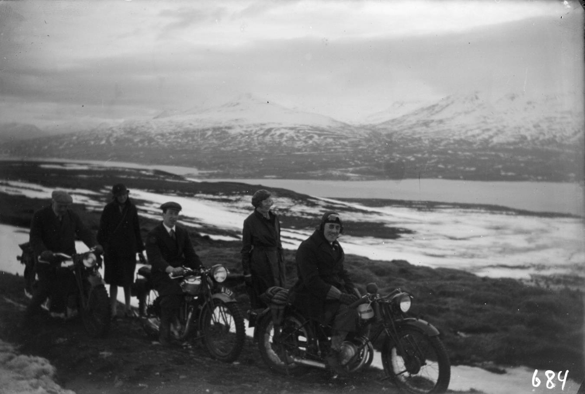 Arthur Gook f.11.6.1883, Eric Gook f.9.3.1911 og Fredirk Livingston Hogg f.14.2.1904 á mótorhjólum í Vaðlaheiðinni.