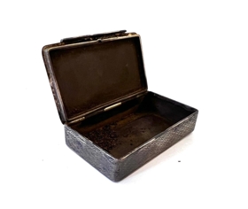 Lítil tóbaksdós úr málmi. Líklega úr búi séra Þorvarði G Þormar, prests í Laufási, Grýtubakkahreppi.