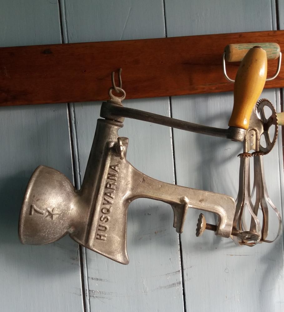 Hakkavél, handsnúin, HUSQVARNA. Gefið af Bjarna Gottskálkssyni úr eigu móður hans, Þórhildar Bjarnadóttur frá Heiði á Síðu.