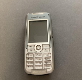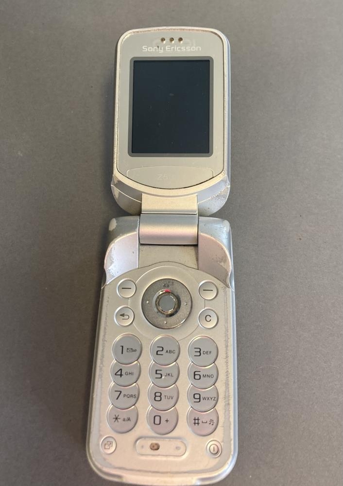 3 símar úr eigu Smára Ólasonar. a) Doro Tripoli, vegghengdur heimasími, b) Sony Ericson samlokusími, c) Sony Ericson sími