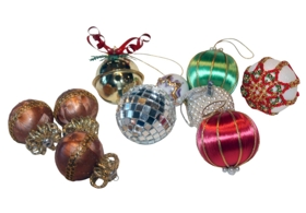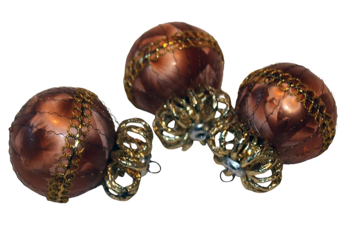 Þrjár jólakúlur brúnar að lit með gylltum skreytingum