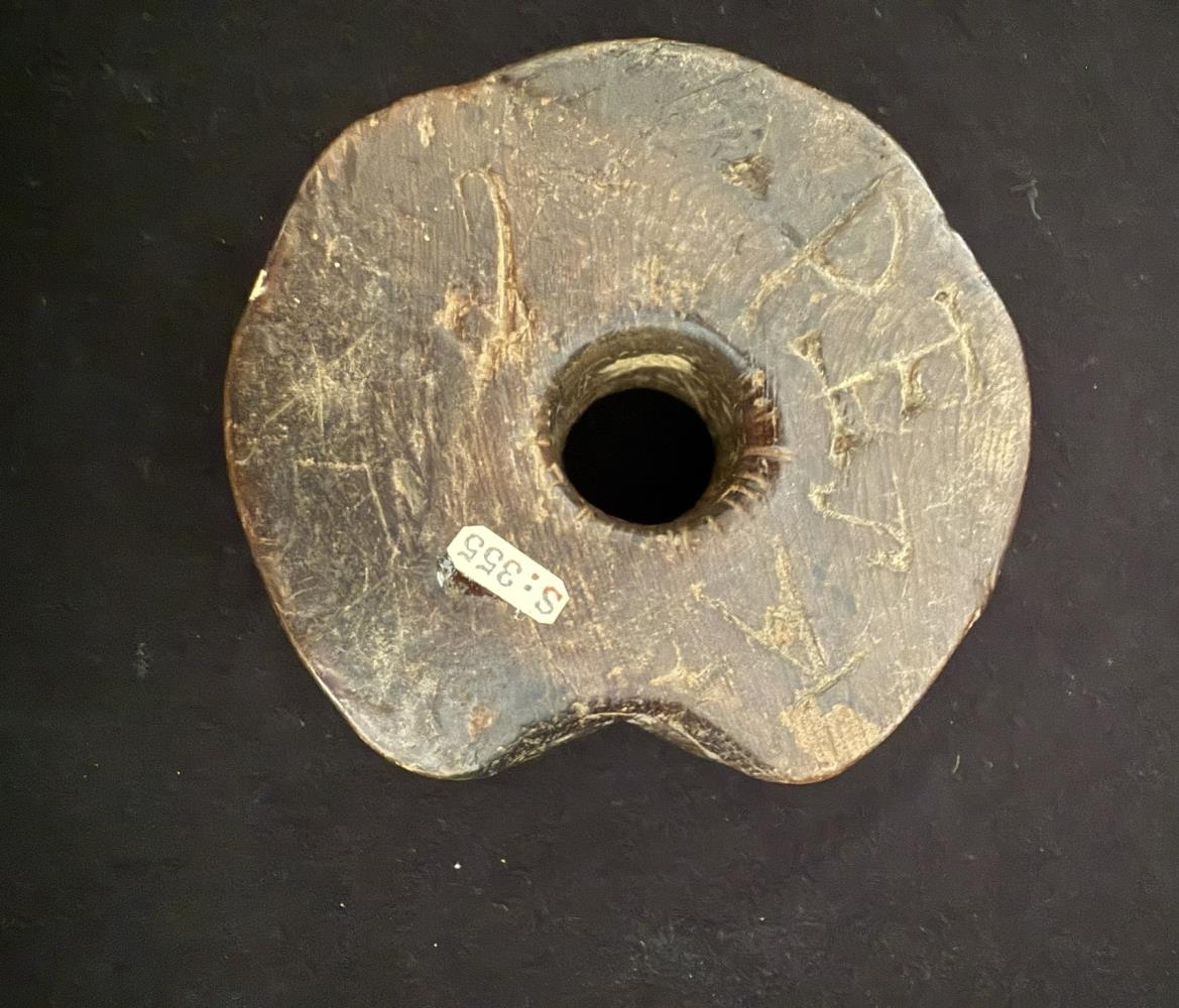 Snældusnúður, útskorinn. Að neðan er letrað á hann: Þ.E.S.A. Sagt er, að Þorstein Eyjólfsson á Vatnsskarðshólum í Mýrdal hafi smíðað hann.