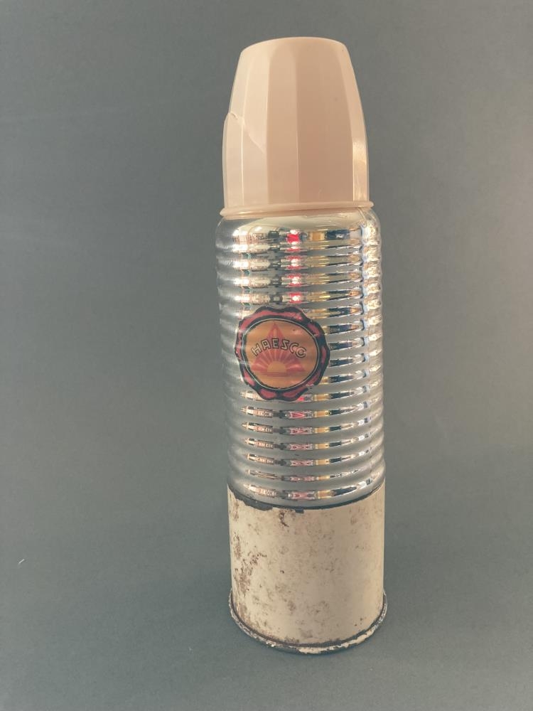 Hitabrúsi (kaffibrúsi) af gerðinni HAESCO, framleiddur í A-þýskalandi. Ál-litaður rifflaður efri hluti, hvítur neðri hluti, nokkuð ryðgaður. Með álímdu merki framleiðanda. Korktappi 3,2 cm að þvermáli. 6cm hátt lok (brotið) úr hvítu bakelite, sem jafnframt má nota sem drykkjarílát.