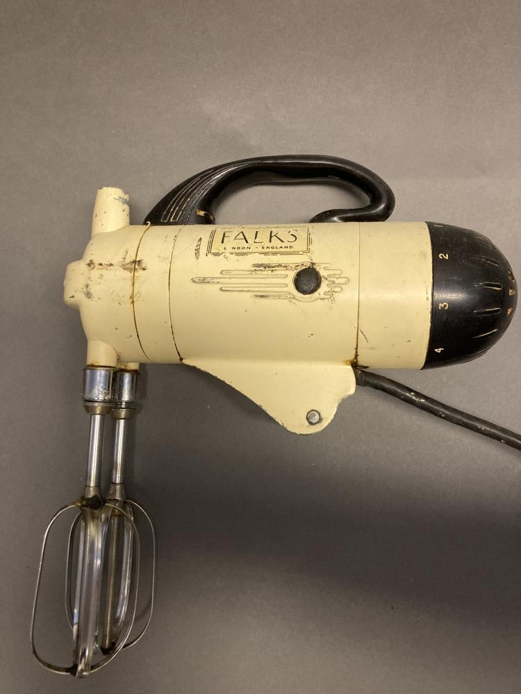 Rafmagnshandþeytari/hrærivél frá Falks, framleiddur í Englandi, með ýmsum fylgihlutum, hvítri glerskál, tveimur þeytispöðum úr stáli og berjapressu. Litur: Rjómagulur og svartur. Glerskál er merkt undir botni: "Glasbake 12 - Made in USA - for Sunbeam".