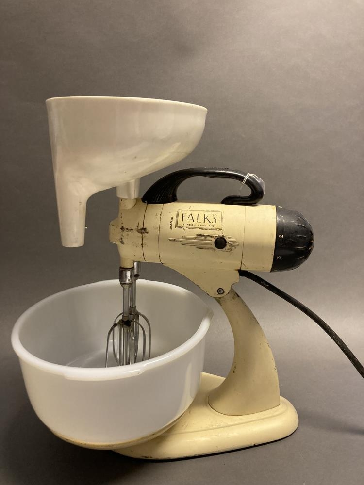 Rafmagnshandþeytari/hrærivél frá Falks, framleiddur í Englandi, með ýmsum fylgihlutum, hvítri glerskál, tveimur þeytispöðum úr stáli og berjapressu. Litur: Rjómagulur og svartur. Glerskál er merkt undir botni: "Glasbake 12 - Made in USA - for Sunbeam".