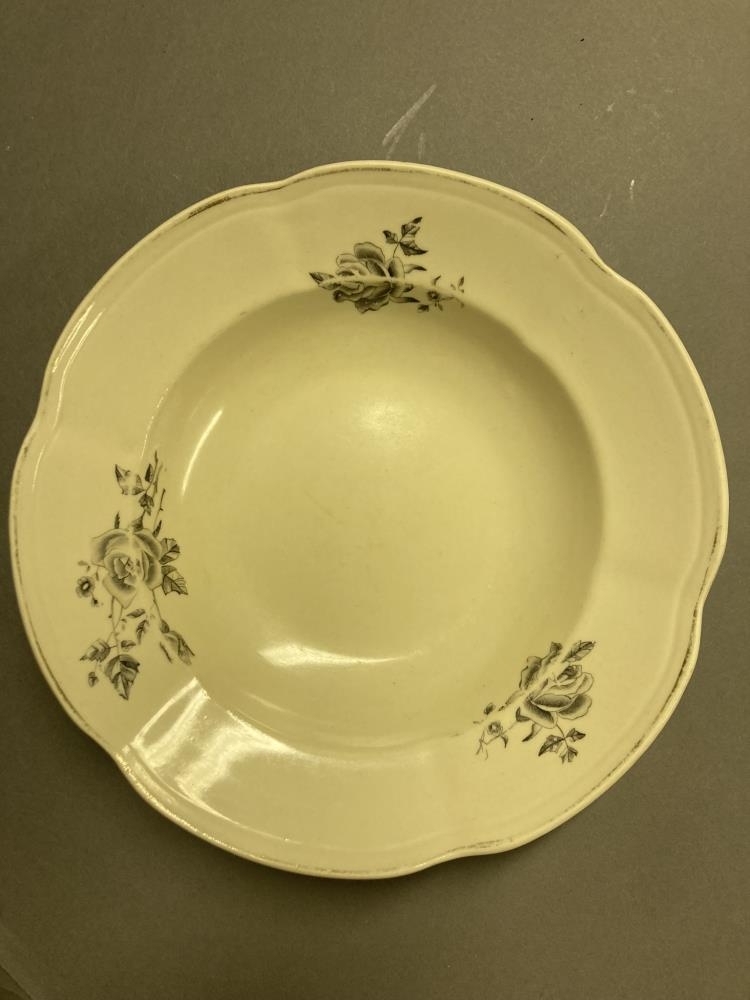 Súpudiskur, ljós með gráu rósamynstri. Framleiðandi er CHODZIES Póllandi.