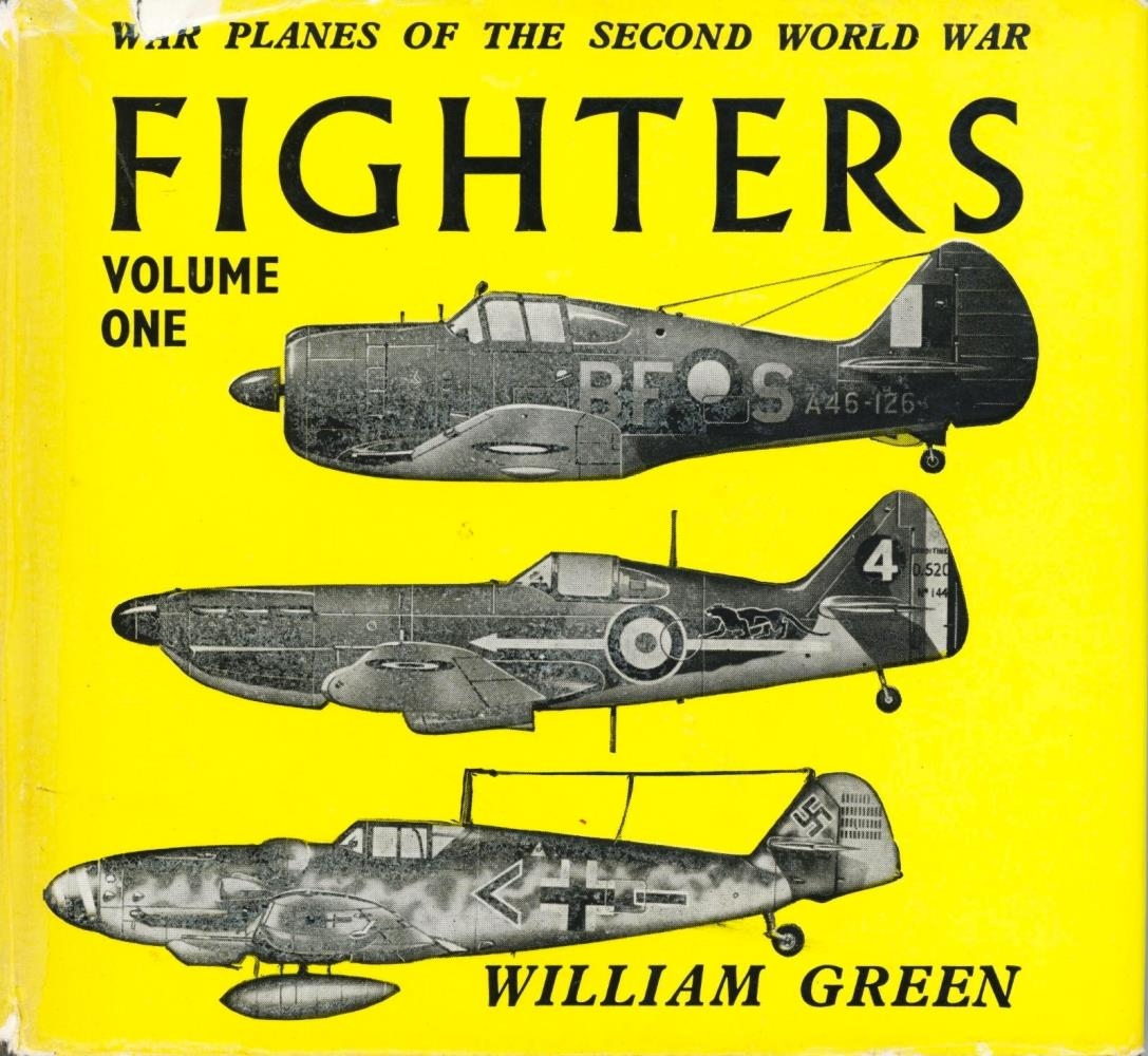 Orrustuflugvélar í seinni heimsstyrjöld, fyrsta bindi. Bókin er lítil í harðri kápu, gul með myndum af orrustuflugvélum.