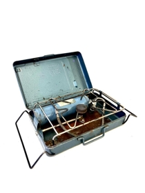 Ferðaprímus. Ferkantaður lokaður kassi, blár málmur. Járnin sem spenna hann saman eru líka fætur þegar hann er opnaður.
