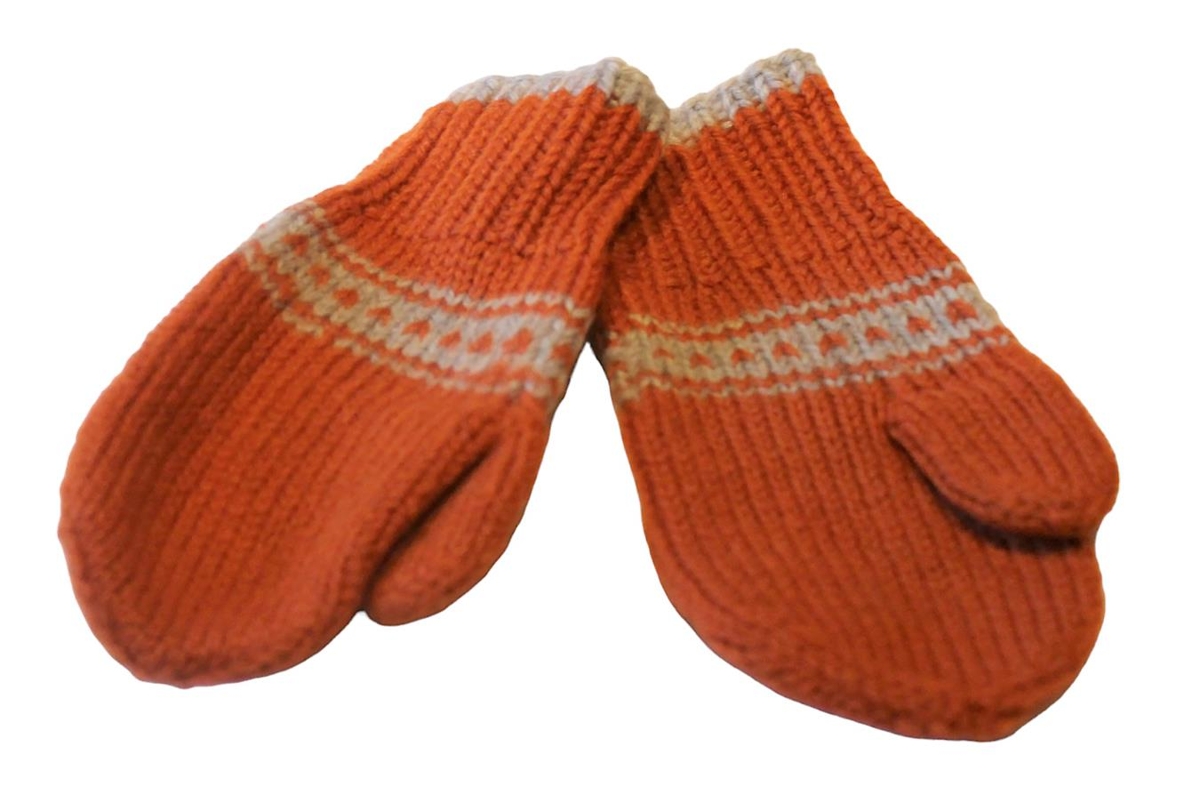 Ryðrauðir barnavettlingar með gráu munstri í.